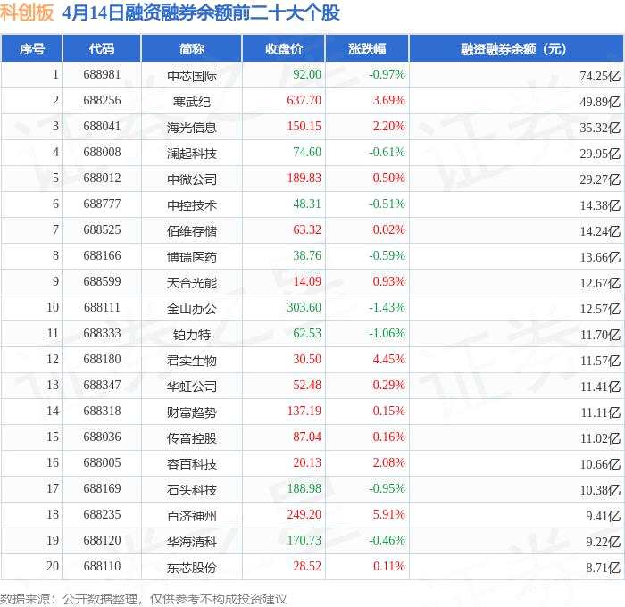 科創(chuàng)板融資融券余額前三分別為:中芯國際(688981)融資融券余額74.25億元、寒武紀(688256)融資融券余額49.89億元、海光信息(688041)融資融券余額35.32億元,前20具體見下表: