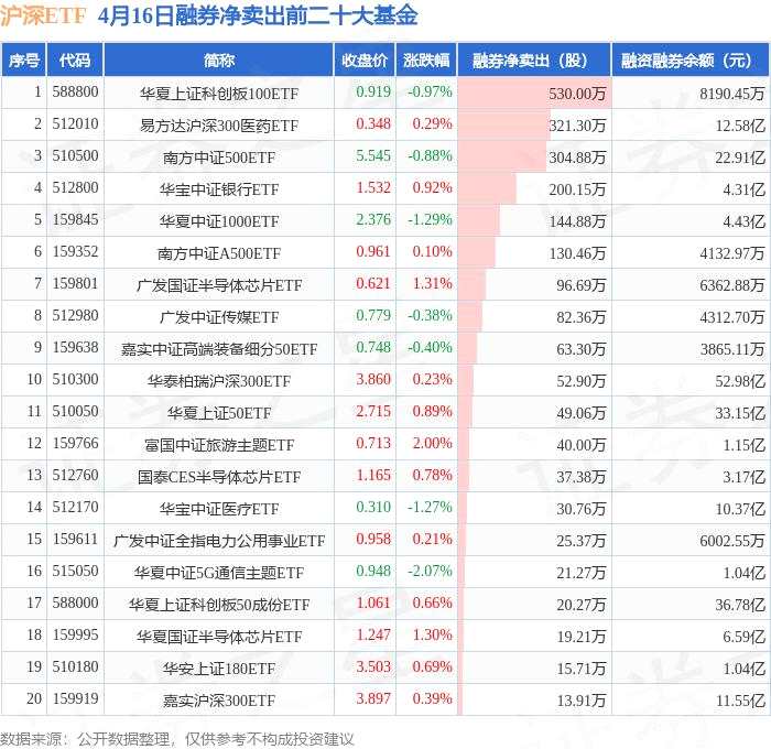 4月16日滬深ETF融券凈賣出排行榜:華夏上證科創(chuàng)板100ETF融券凈賣出居首