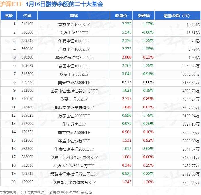滬深ETF融券余額前三分別為:南方中證1000ETF(512100)融券余額15.44億元、南方中證500ETF(510500)融券余額13.81億元、華夏中證1000ETF(159845)融券余額3.79億元,前20具體見下表: