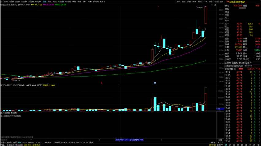 9月22日盤中科創(chuàng)板股宏力達(dá)漲停,發(fā)稿,股價(jià)報(bào)40.74元,成交5.33億元,換手率9.53%。