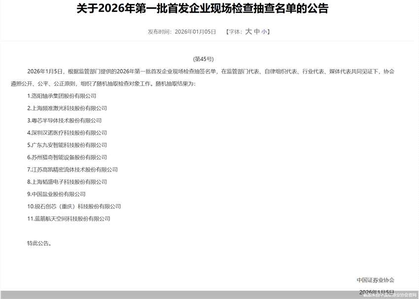 1月5日,中國證券業(yè)協(xié)會官網發(fā)布“2026年第一批首發(fā)企業(yè)現(xiàn)場檢查抽查名單”,藍箭航天、頻準激光、粵芯半導體、洛軸股份等11家企業(yè)被抽中現(xiàn)場檢查。值得關注的是,上述11家IPO企業(yè)中,半數(shù)來自科創(chuàng)板。