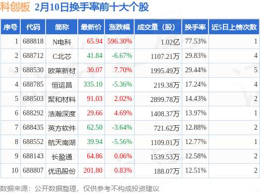 2月10日科創(chuàng)板換手率前十大個股,N電科居首