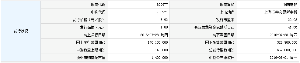 中國電影7月28日發(fā)行 申購上限為14萬股