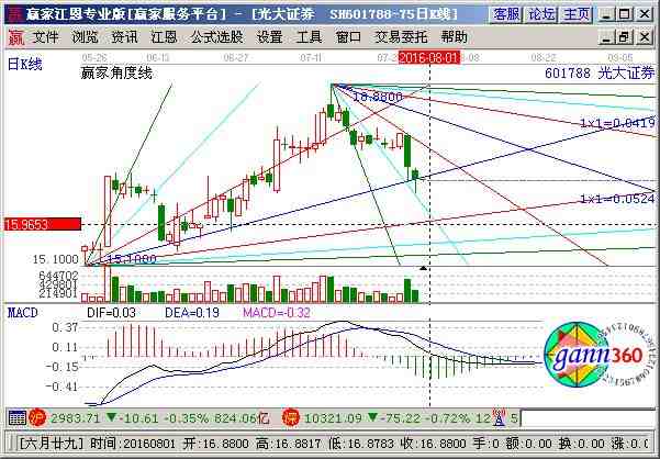 601788股票分析綜合評論:光大證券601788當(dāng)前趨勢運(yùn)行在生命線以下弱勢休息區(qū)域,中期資金籌碼占流通盤72.25%,主力控盤度較高大方向依然樂觀。通過江恩價格工具分析,該股短期支撐是15.38元,阻力是17.3元;通過江恩時間工具分析,該股短期時間窗為 2016-07-25號和2016-08-15號,中期時間窗2016-09-05號和2016-10-09號 ,結(jié)合持倉成本做好計劃。