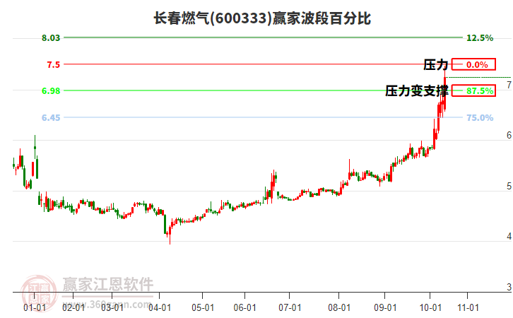 我們采用波段百分比對(duì)長(zhǎng)春燃?xì)膺M(jìn)行空間分析:短期處于上行趨勢(shì),目前該股突破波段百分比工具所顯示的6.98元,如此線支撐不破,上方壓力關(guān)注7.5元。