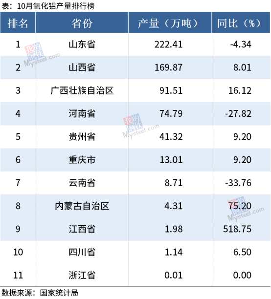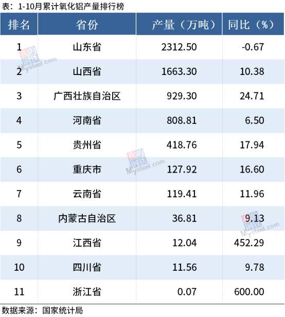 統(tǒng)計(jì)局:10月氧化鋁分省市產(chǎn)量出爐,山東占比35.3%