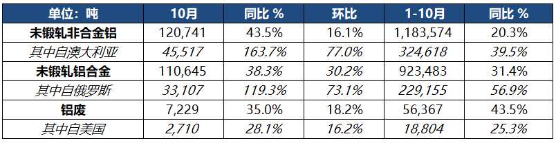 10月日本進(jìn)口未鍛軋鋁合金11萬噸,環(huán)比增長38%,較去年同期增長30%。1-10月共計(jì)進(jìn)口未鍛軋鋁合金92.3萬噸,同比增長31%,其中來自主要供應(yīng)國俄羅斯23萬噸。
