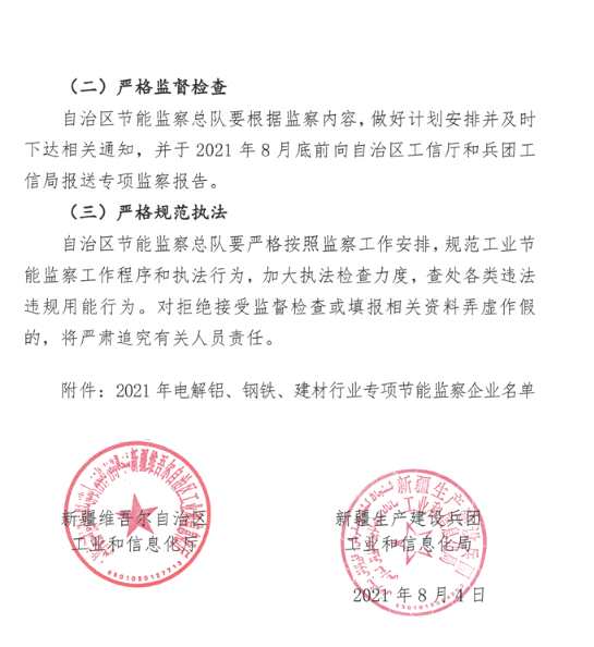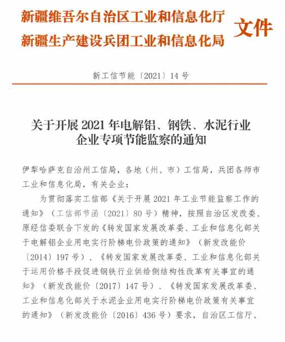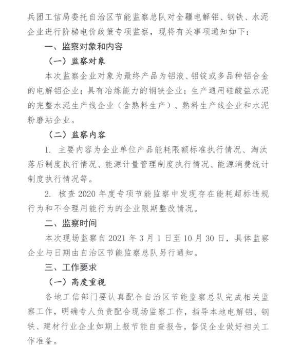 附原文:關(guān)于開展2021年電解鋁、鋼鐵、水泥行業(yè)企業(yè)專項(xiàng)節(jié)能監(jiān)察的通知