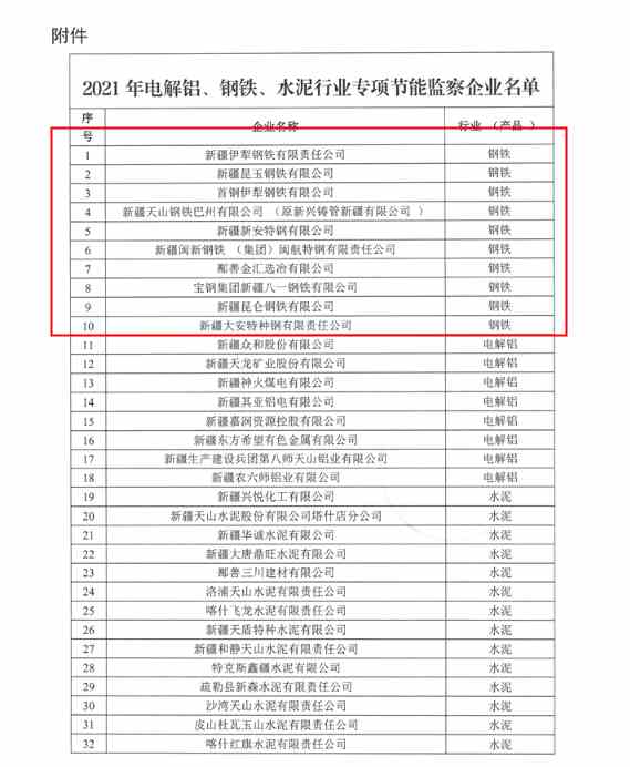 近日,新疆發(fā)布關(guān)于開展2021年電解鋁、鋼鐵、水泥行業(yè)企業(yè)專項(xiàng)節(jié)能監(jiān)察的通知,涉及鋼鐵企業(yè)10家。