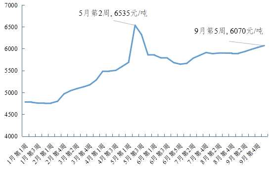 9月份,鋼材價格持續(xù)上行。據(jù)我中心監(jiān)測數(shù)據(jù),9月全國主要鋼材批發(fā)市場鋼材平均價格在高位連續(xù)小幅上行,第5周鋼材價格為6070元/噸,較8月底價格上漲182元,漲幅為3.1%,高于去年同期43%。
