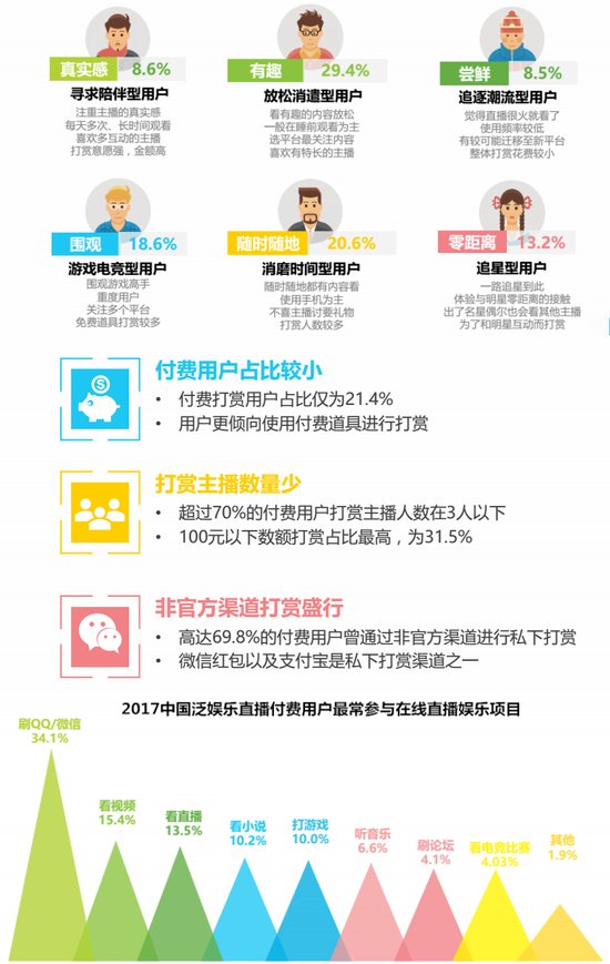 數(shù)據(jù)告訴我們,愛看直播的用戶分為六種類型,分別為尋求陪伴型、放松消遣型、追逐潮流型、游戲電競型、消磨時(shí)間型、追星型,其中放松消遣型用戶最多,占比近30%。愿意為直播付費(fèi)的用戶僅有21.4%,用戶傾向于使用付費(fèi)道具進(jìn)行打賞,超過70%的付費(fèi)用戶打賞主播人數(shù)在3人以下,且多數(shù)集中在百元以下打賞。而眾多用戶中,利用非官方渠道進(jìn)行私下打賞的高達(dá)69.8%,這也衍生出一系列的社會(huì)問題,中小主播與新主播的生存環(huán)境不佳。