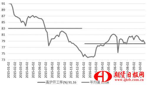 全國范圍內(nèi),9月以來高爐開工率緩慢下降,11月,高爐開工率較高點已下降4個百分點。冬季臨近,北方霧霾較為嚴重,部分重點城市開啟限產(chǎn)模式。而限產(chǎn)導致鋼廠高爐生產(chǎn)階段性中斷,對焦炭需求形成利空。此外,2017年是鋼鐵去產(chǎn)能重點執(zhí)行年份,相比煤炭行業(yè),鋼鐵行業(yè)去產(chǎn)能計劃滯后,后期勢必加大力度,進而對焦炭需求形成壓制。