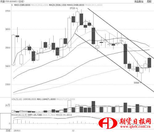 從均線系統(tǒng)來看,1705合約的5日、10日和20日均線已轉(zhuǎn)為空頭排列,雖然本周期價(jià)有所反彈,但昨日攀升至10日均線之上便遭遇到明顯的拋壓,收出中陰線形態(tài),暗示上行壓力較大。