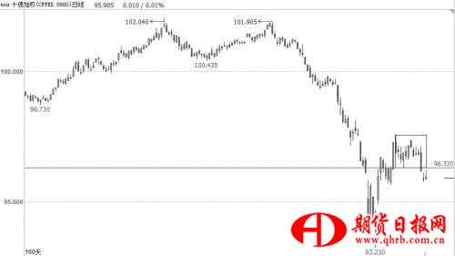 十債加權(quán)指數(shù)經(jīng)歷2016年第三季度的暴跌后,于今年年初形成反彈,但反彈高度極為有限。超跌反彈后,做多資金主動(dòng)離場(chǎng),本周以來(lái)再度呈現(xiàn)增倉(cāng)放量下跌之勢(shì)。圖形上,期價(jià)跌破振蕩區(qū)間下沿,進(jìn)一步下探概率較大。期債弱反彈已結(jié)束,二次尋底行情展開(kāi)。操作上,可待反彈至96.32點(diǎn)做防守,輕倉(cāng)參與空單,下方支撐95點(diǎn)附近。 (中原期貨 李衛(wèi)紅)