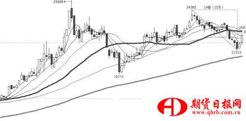 滬鋅經(jīng)歷19個交易日的調(diào)整走勢后,上周五收出小陽線,形成典型的孕線形態(tài),預(yù)示短線見底。周一價格放量上漲,收復(fù)60天均線,且收盤價站在前四根K線高點(diǎn)上方,符合“四周法則”看漲結(jié)構(gòu)。22000元/噸是前期振蕩平臺低點(diǎn)位置,多頭本次在該位置發(fā)力,“四兩撥千斤”效果明顯。操作上,建議逢回調(diào)參與多單,止損22000元/噸,短線阻力位23100元/噸。
