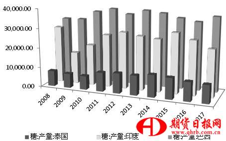 圖為白糖主產(chǎn)國產(chǎn)量