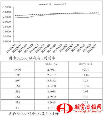 摘要: 5月12日,隔夜、1周、1個(gè)月Shibor出現(xiàn)下行,分別下跌2.19、1.87、0.39個(gè)基點(diǎn),報(bào)收2.7911%、2.9107%、4.0468%。2周、3個(gè)月、6個(gè)月、9個(gè)月、1年Shibor分別上