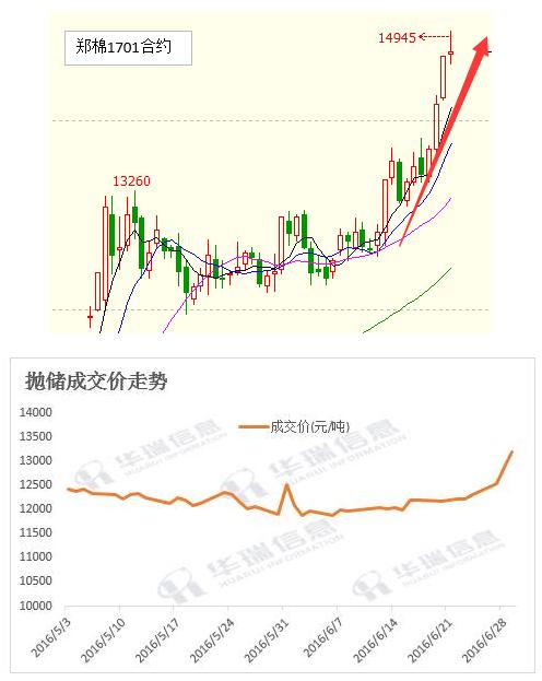 鄭棉期貨1701合約經(jīng)歷上周短暫橫盤調(diào)整,本周開盤連收大陽線,截止周四(6月30日)收盤報14725元/噸,較上周五(6月24日)的13430元/噸上漲近1300元/噸,漲幅9.6%。受期棉帶動,本周拋儲成交價也連創(chuàng)新高,6月29日成交均價破萬三至13202元/噸。