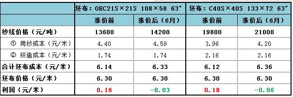 表中,棉紗價格不同程度上漲, 坯布價格基本不變,體現(xiàn)在利潤上4月左右全棉坯布還有1毛多的利潤,而4-6月棉紗漲價后,利潤多出現(xiàn)虧損。