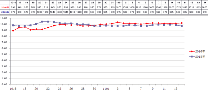 1、豬肉價(jià)格:2016年11月11日,新發(fā)地市場(chǎng)白條豬的批發(fā)平均價(jià)是10.10元/斤,比2016年11月4日的10.13元/斤下降0.30%;比2016年10月11日的9.60元/斤上漲5.21%;比2015年11月11日的9.70元/斤上漲4.12%。周環(huán)比微幅下降;月環(huán)比明顯上漲;年同比小幅上漲。上周末,年同比價(jià)格上漲4.43%,本周同比漲幅略有收窄。本周,新發(fā)地市場(chǎng)白條豬批發(fā)的平均價(jià)進(jìn)入階段性調(diào)整階段,小幅波動(dòng),沒有出現(xiàn)明顯的漲落。