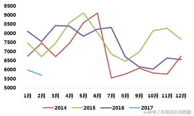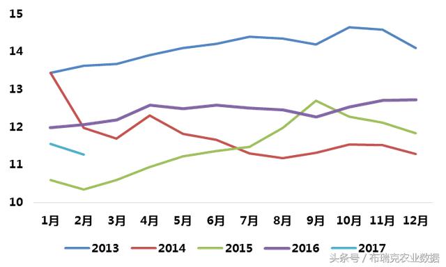 芝華的蛋雞存欄數(shù)據(jù)顯示,2017年2月全國蛋雞總存欄量為13.3億只,較1月減少2.49%,同比減少8.83%;在產(chǎn)蛋雞存欄量為11.27億只,較1月減少2.38%,同比去年減少6.56%。根據(jù)往年的數(shù)據(jù)來看,目前的在產(chǎn)蛋雞存欄僅高于2015年2月的10.35億只。