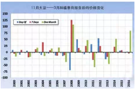 下圖顯示了USDA過去16年間報告后當日、一周、一個月內(nèi)大豆的走勢情況,在報告當天16年間有8年下跌,8年上漲,下跌概率為50%,報告后一周內(nèi)也有6年下跌,10年上漲,下跌概率為37.5%。而在過去三年中,USDA報告并沒有出現(xiàn)多少意外,市場價格走勢也并未出現(xiàn)明顯的變化。