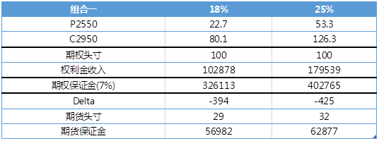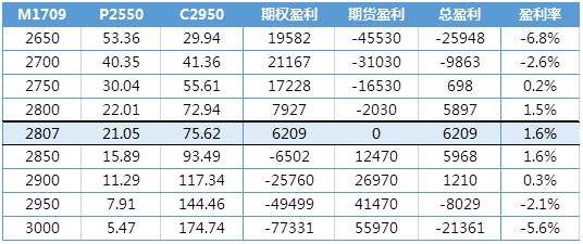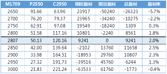 由于USDA報告期漸進,市場預(yù)期的不斷上升,M1709期權(quán)合約的隱含波動率一定會出現(xiàn)不同程度的上升。筆者假設(shè)M1709在2017年3月31日收盤價為2807元/噸,期權(quán)的隱含波動率可能為18%或25%,對此我們進行了分別的演算。