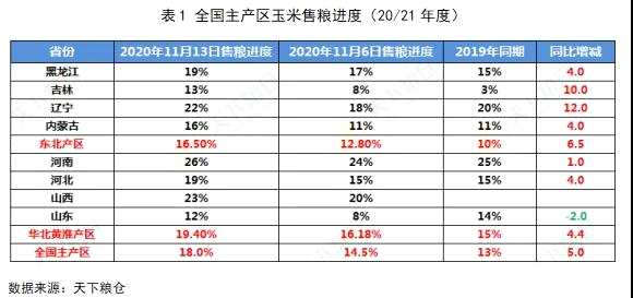 全國(guó)地區(qū)玉米收割完成,新玉米購(gòu)銷(xiāo)熱情高,中儲(chǔ)糧入市開(kāi)啟輪換給與市場(chǎng)信心。據(jù)天下糧倉(cāng)數(shù)據(jù)顯示:截止到11月13日全國(guó)主產(chǎn)區(qū)玉米銷(xiāo)售進(jìn)度為18%,同比增加5%;其中東北地區(qū)售糧進(jìn)度為16.5%,同比增加6.5%;華北黃淮產(chǎn)區(qū)銷(xiāo)售進(jìn)度為19.4%,同比增加4.4%。從貿(mào)易商情緒上來(lái)看,東北地區(qū)走貨正常,華北地區(qū)上量較小,因農(nóng)戶惜售情緒轉(zhuǎn)強(qiáng)。