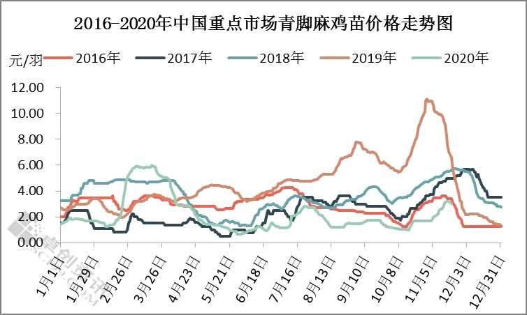 由上圖可以看出,2016-2019年過年雞補(bǔ)欄時(shí)期,雞苗價(jià)格整體上漲,且漲幅較為明顯,特別是2019年雞苗價(jià)格一度漲至11.00元/羽,但2020年過年雞補(bǔ)欄時(shí)期雞苗市場(chǎng)卻較為反常。