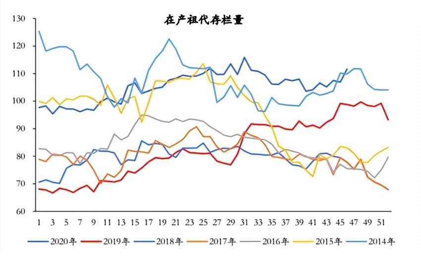 據(jù)中國禽業(yè)分會披露數(shù)據(jù),11月第2周在產(chǎn)祖代種雞存欄111.63萬套,周環(huán)比漲4.4%,同比漲13.0%;后備祖代種雞存欄43.96萬套,周環(huán)比跌11.7%,同比跌23.8%;在產(chǎn)父母代種雞存欄1497.17萬套,周環(huán)比漲0.8%,同比跌5.6%;后備父母代種雞存欄1012.17萬套,周環(huán)比跌2.9%,同比漲5.2%。在產(chǎn)祖代雞存欄依然處于高位,而在產(chǎn)父母代雞存欄則已低于去年同期,回落至2017年、2018年同期的水平,這也意味著,短期的供應(yīng)壓力有所緩解,但產(chǎn)能真正去化力度仍有限。