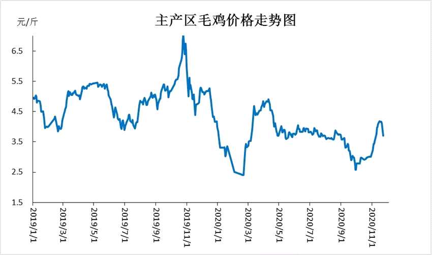 11月20日,在高位滯漲幾日后,產(chǎn)區(qū)毛雞價格出現(xiàn)回落跡象。此后幾日,跌勢快速擴大,至11月23日,主產(chǎn)區(qū)毛雞價格已經(jīng)回落至3.7元/斤,短短4天,累計跌幅接近0.5元/斤,跌幅已超過10%。
