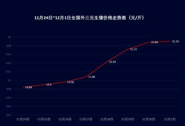 自從11月24日開始,豬價出現(xiàn)“爆發(fā)式”上漲現(xiàn)象,根據(jù)“動力豬價”指數(shù)統(tǒng)計,短短七天時間,豬價從14.84元/斤上漲到15.90元/斤,一周時間,漲幅超過1元,四川、重慶、廣西、海南等省區(qū)甚至突破了17元/斤的關(guān)口。