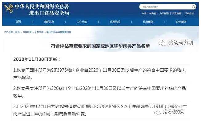 11月30日,海關(guān)總署更新《符合評估要求的國家或地區(qū)輸華肉類產(chǎn)品名單》。其中,恢復(fù)丹麥、巴西各一家豬肉企業(yè)產(chǎn)品對華出口,暫停阿根廷一家企業(yè)牛肉產(chǎn)品輸華。