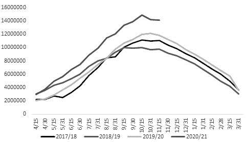 全球第一大白糖生產(chǎn)國巴西已經(jīng)臨近甘蔗壓榨收尾階段,最早明年3月2021/2022榨季的巴西糖才會開始供應(yīng)。截至11月中旬,巴西中南部累計產(chǎn)糖量達到3766.4萬噸,同比增加1159.17萬噸。巴西中南部糖產(chǎn)量約占巴西總糖產(chǎn)量的90%,極具代表性。據(jù)相關(guān)統(tǒng)計,2020年4月至11月巴西累計出口食糖2514.81萬噸,同比增加1175萬噸,這幾乎涵蓋了巴西當前榨季累計增量。巴西糖庫存已經(jīng)進入季節(jié)性下降趨勢中,加上近期雷亞爾升值,巴西國內(nèi)以雷亞爾計價的不斷攀升創(chuàng)新高的糖價,預(yù)計巴西糖出口動力將下降。