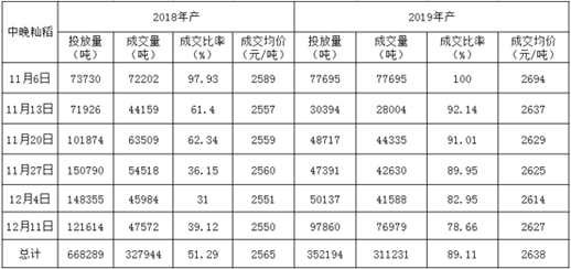 由于農(nóng)戶惜售,外地儲(chǔ)備庫(kù)補(bǔ)庫(kù),市場(chǎng)上余糧較少,加工企業(yè)多通過(guò)國(guó)家糧食電子交易平臺(tái)拍買獲取主要糧源,加之2018和2019年產(chǎn)稻谷品質(zhì)相對(duì)較好,導(dǎo)致拍買競(jìng)價(jià)激烈,2019年產(chǎn)中晚秈稻最高價(jià)達(dá)到2775元/噸,交易量放大。