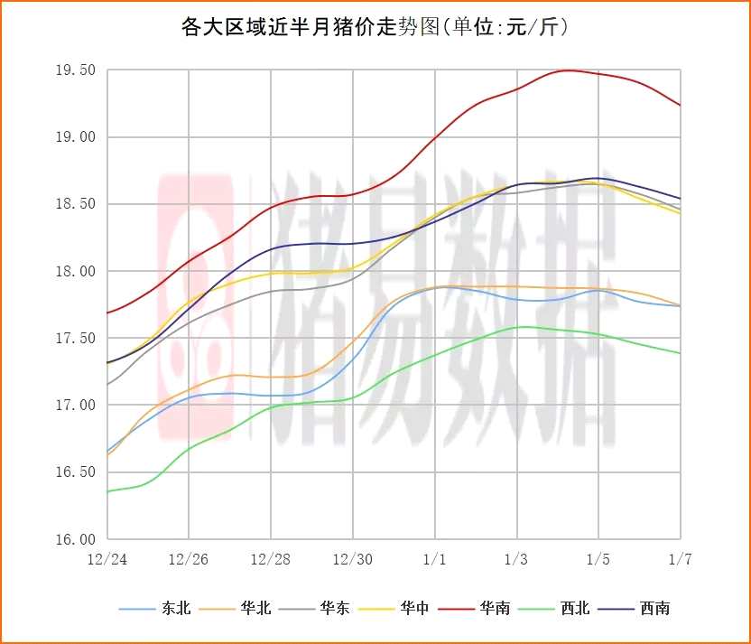 華北、華中、華南、西北、東北、華東、西南地區(qū)豬價微幅下跌,生豬平均價格繼續(xù)呈現(xiàn)下跌態(tài)勢。