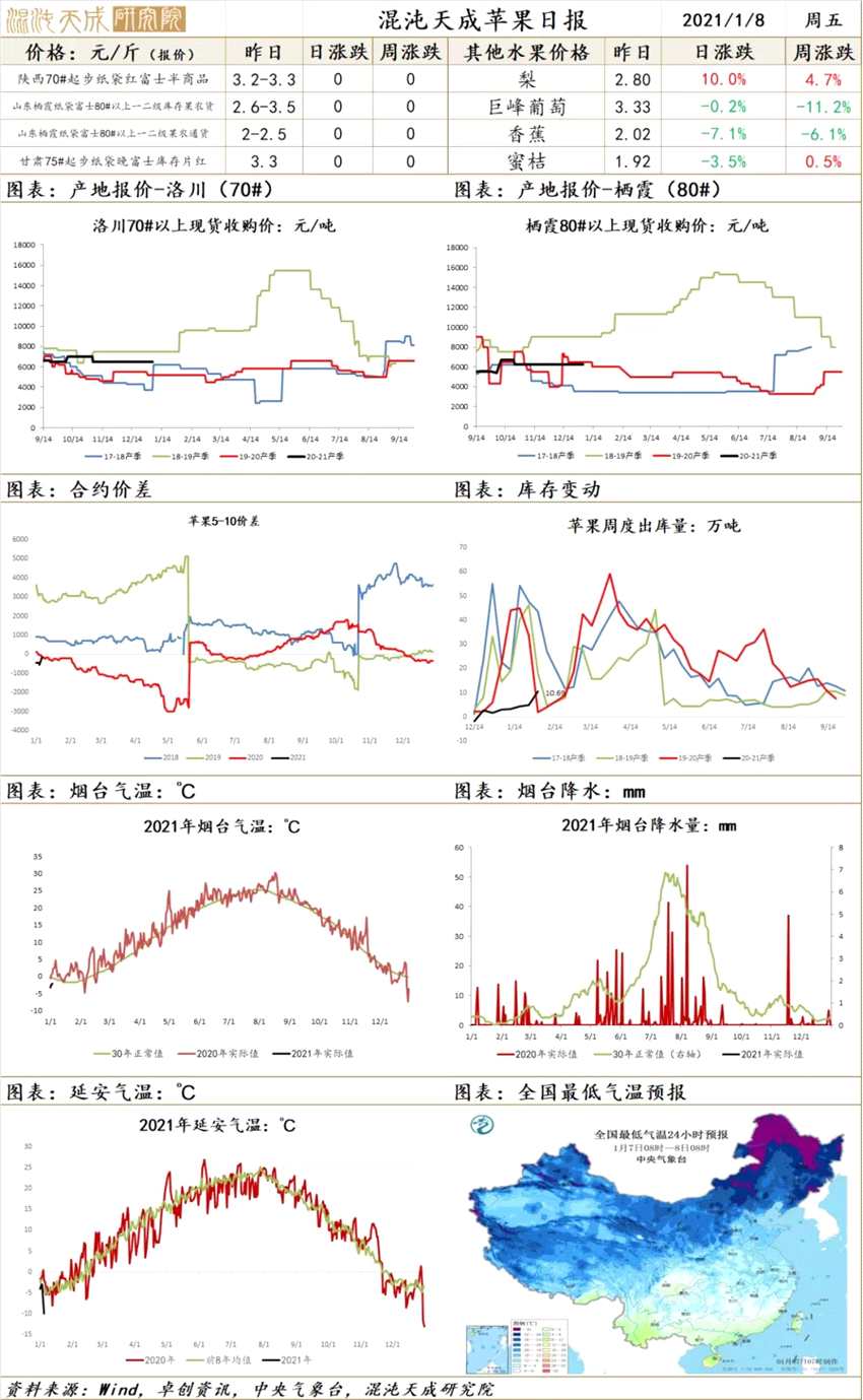 1月6日以來全國降溫明顯,山東煙臺(tái)產(chǎn)區(qū)降雪量大,部分高速路段已經(jīng)封停,短期對(duì)蘋果冷庫出庫有一定影響,近期在本身高庫存以及柑橘降價(jià)銷售的雙重壓力下,蘋果產(chǎn)地實(shí)際成交價(jià)格有所下調(diào),使得詢價(jià)客商略有增加。在整體水果供應(yīng)過剩的大背景下,水果價(jià)格終將下跌,而從節(jié)奏上看,由于柑橘的銷售期短,跌價(jià)會(huì)來的更早,而蘋果價(jià)格下跌的預(yù)期持續(xù)存在,1-2月份偏空看待。另外因農(nóng)歷春節(jié)之后蘋果需求有復(fù)蘇的預(yù)期,和對(duì)21-22產(chǎn)季花期天氣的炒作題材,春節(jié)之后再布局多單會(huì)更合適。