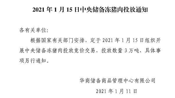 據(jù)華儲(chǔ)網(wǎng)消息,根據(jù)國家有關(guān)部門安排,定于2021年1月15日組織開展中央儲(chǔ)備凍豬肉投放競(jìng)價(jià)交易,投放數(shù)量3萬噸,具體事項(xiàng)另行通知。