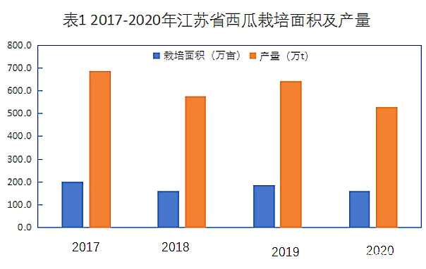 據(jù)不完全統(tǒng)計(jì),2017年江蘇省西瓜種植面積200.3萬畝、產(chǎn)量686.0萬噸,甜瓜種植面37.5萬畝、產(chǎn)量87.1萬噸。西甜瓜總面積237.8萬畝,產(chǎn)量773.2萬噸。截至2020年8月,江蘇省西瓜種植面積160.1萬畝、產(chǎn)量528.3萬噸,甜瓜種植面30.6萬畝、產(chǎn)量67.3萬噸,全省西甜瓜種植面積190.7萬畝,產(chǎn)量595.6萬噸(表1,表2)。