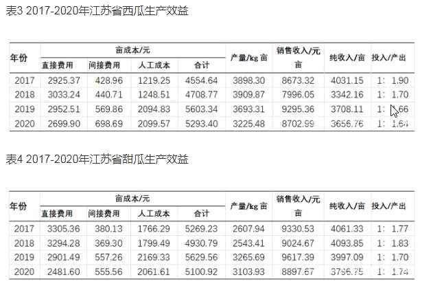 2020年,受新冠疫情影響,西瓜畝生產(chǎn)成本為0.53萬元,比上一年度降低5.53%,但人工成本比上一年度增加0.23%。甜瓜畝生產(chǎn)成本為0.51萬元,比上一年度降低9.39 %;人工成本比上一年度降低4.97%。西甜瓜人工成本在生產(chǎn)成本中占了很大比例,達(dá)到40%。