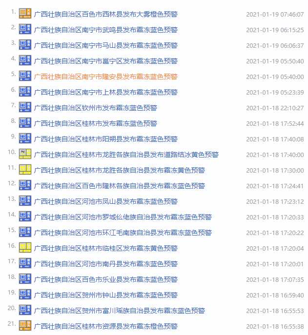 1月19日的霜凍地區(qū)預(yù)警如下:南寧武鳴區(qū)氣象局19日6時15分發(fā)布霜凍藍色預(yù)警信號:24小時內(nèi)武鳴區(qū)最低氣溫將低于4度且可能出現(xiàn)霜凍,將對農(nóng)業(yè)產(chǎn)生影響,請防范。