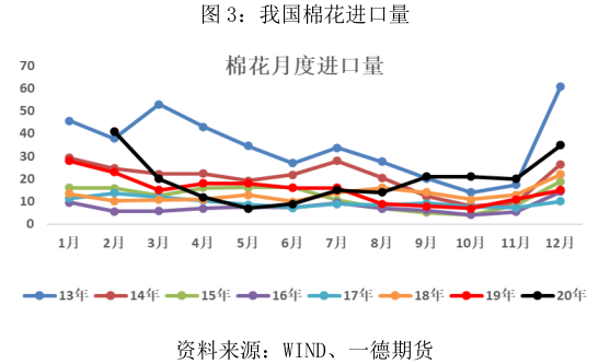 19/20年度累計進口棉花160萬噸,同比降低22%,20/21年度前四個月累計進口了97萬噸,同比增加了1.4倍,2020年以來,我國從美國進口的棉花占比增加27%,從巴西進口的棉花占比與前一年基本相同,從澳大利亞進口的棉花占比降低了16%。由此可見,與最大也是最重要的棉花國家美國的相關貿易恢復情況在持續(xù)改善中。