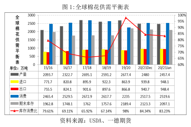 全球棉花的產量預期在不斷下調,1月份usdA將全球棉花產量較前一年度下調220萬噸,較前一個月下調22.6萬噸,而消費預期則持續(xù)向好,預計同比去年將提高284.6萬噸,比上月的消費預期還提高2.1萬噸,年度的預期從開始的供需過剩逐步調整為供需不足,且缺口有望繼續(xù)擴大,由此導致全球棉花的庫存消費比從高位逐步下調,庫存壓力持續(xù)減輕,供需形勢以及從疫情剛開始爆發(fā)期間的悲觀逐步明顯好轉,加上寬松的宏觀環(huán)境和流動性,年度內價格有繼續(xù)提高的基本面基礎。中短期內,庫存消費比雖然有明顯走低,但是絕對值依然處于歷史相對高位,全球棉花市場還處于累庫狀態(tài),依然需要疫情后的經濟重啟來加快需求的恢復。