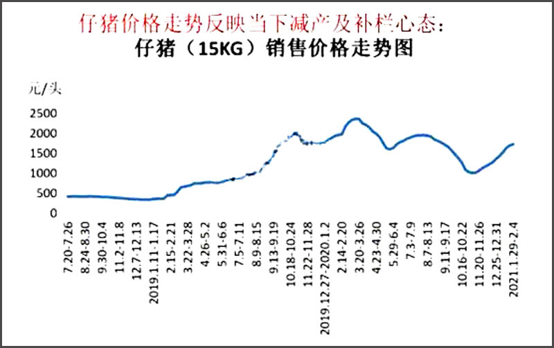 當然,除了機構(gòu)監(jiān)測2021年1月份母豬存欄環(huán)比下降4.99%以后,另一變局也顯示了市場對于豬價后市的底氣!據(jù)機構(gòu)監(jiān)測顯示,市場15公斤仔豬銷售價格呈現(xiàn)持續(xù)上漲的態(tài)勢,價格從2020年10月頭均1000元,上漲至2021年2月初頭均1700元!仔豬價格的持續(xù)走強,也反映出了2個新信號!