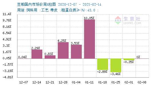 根據(jù)2020年12月-2021年2月14日的周度漲跌圖可以看出,12月中旬開(kāi)始,每周豆粕價(jià)格均呈現(xiàn)上漲之勢(shì),一直漲到1月中旬。最大漲幅出現(xiàn)在1月第二周,漲幅超過(guò)10%。