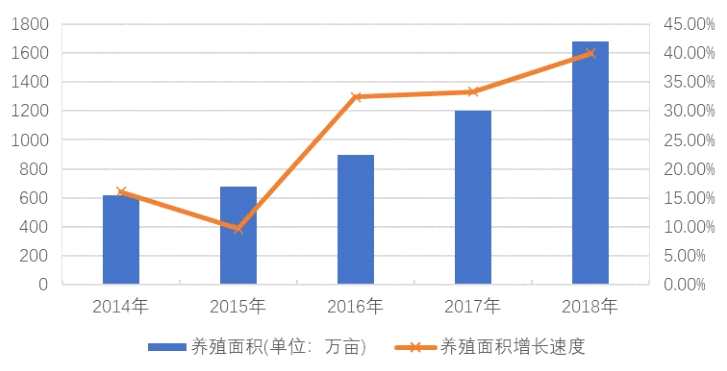 1.養(yǎng)殖面積快速擴大。近年來,我國小龍蝦養(yǎng)殖面積連續(xù)5年持續(xù)增長,2016年以來增長速度明顯加快。2018年我國小龍蝦養(yǎng)殖面積突破1680萬畝,較2017年增長約40%(圖1)。