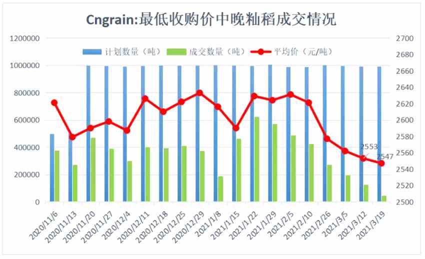 當(dāng)前國內(nèi)糧食市場一片回落,玉米跌,小麥跌,水稻也跌。不過今天的中晚秈稻最低收購價拍賣更低迷,不僅成交率再創(chuàng)新低,僅4.16%,最高成交價2650和成交均價2547也同步淪落,整個盤面可以用一個詞來形容,慘不忍睹!