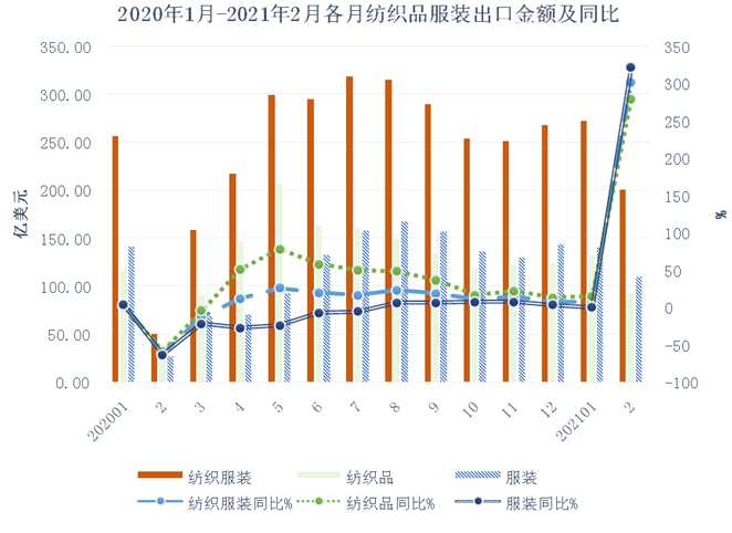 2021年前兩月,我國紡織品服裝出口額增長主要集中在2月份,在低基數+市場需求回暖+“就地過年”情況下,在春節(jié)期間多地不停工的共同作用下,當月出口實現巨量增長,紡織品服裝、紡織品、服裝當月增幅不僅與去年同期相比分別高達或接近三倍,而且推動當月及累計出口額均超過2019年同期水平。