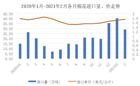 進入2021年,棉花進口延續(xù)去年底的增長趨勢,前兩月累計進口69萬噸,同比增長67.5%。美國為第一大進口來源國,自美國累計進口29.8萬噸,增幅超過3倍,美棉占比高達43%。