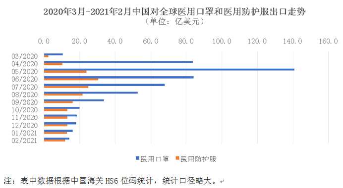 按照中國海關HS6位碼統(tǒng)計(口徑略大),作為主要防疫物資的醫(yī)用口罩和醫(yī)用防護服的出口額于2020年5月達到高峰后逐月回落,但出口規(guī)模仍處于較高水平,1至2月醫(yī)用口罩和醫(yī)用防護服合計出口55.4億美元,占總出口的11.7%,對整體出口提升起到6.4個百分點的拉動作用。